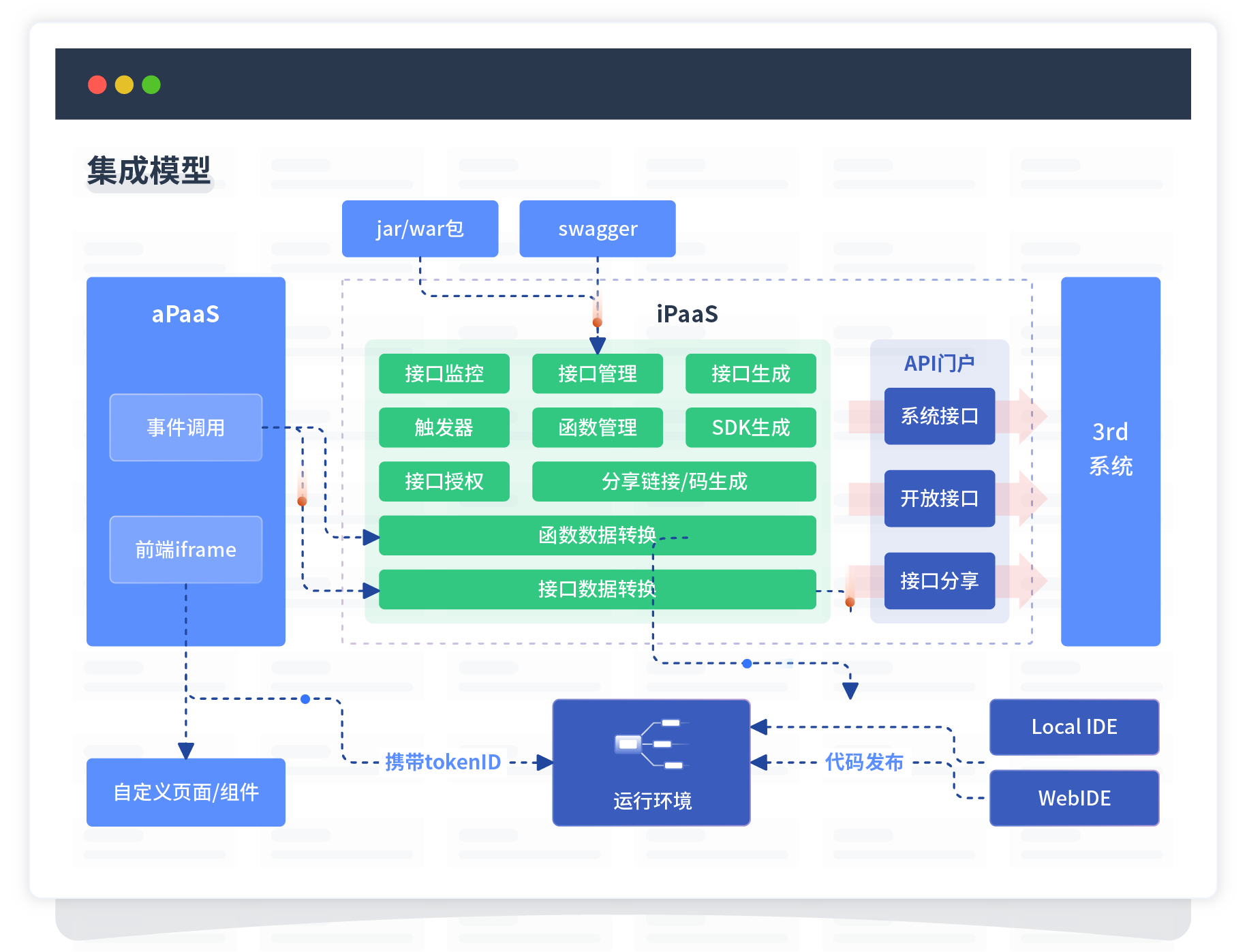 集成模型包括平台本身前、、、、、后端能力的扩展,,,,,,,,也支持通过API门户和第三方系统进行交互。。。。。。。。。。。