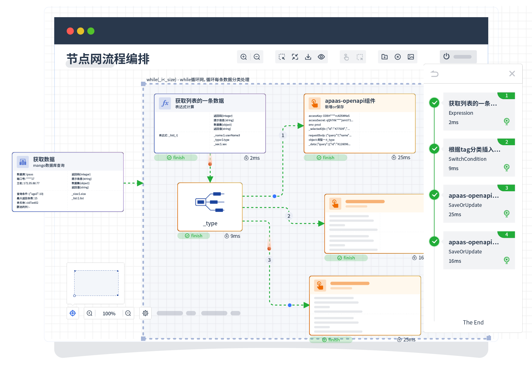 针对集成场景,,,,,组件定义后支持进行流程编制,,,,,,,,不同于传统代码方式,,,,,,,,,,,通过图形化展示,,,,,,,,支持在线调试、、、、、、日志查看和运行回放。。。。